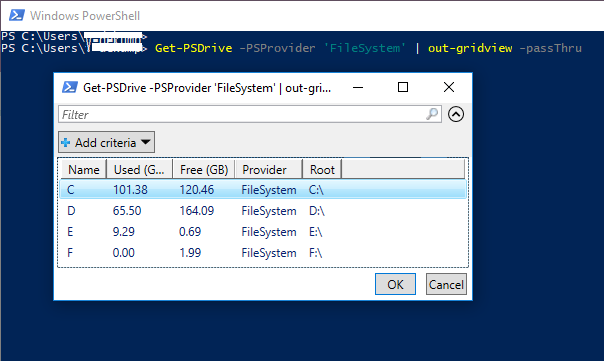 Suppose you have a requirement to select a few drives and pass it to the next command, then we might end up writing filter commands. But I personally prefer to use external window which displays the results in a grid view and support the feature of selecting multiple rows. We can also pass the selected values to the next command by using -passThru variable. Let's see how we can do it. We have to use the cmdlet Out-GridView.
