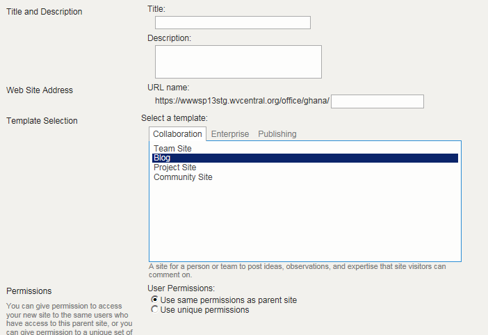 4) If you wish to have the same user and content permissions as the parent site, click the Use same permissions as parent site radio button. If you wish this subsite to have different permissions than other parts of your site, click on Use unique permissions.