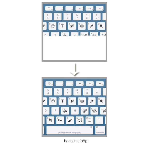 The preceding image demonstrates how a baseline JPEG is rendered. A baseline JPEG is the full resolution top to bottom scan of the image.