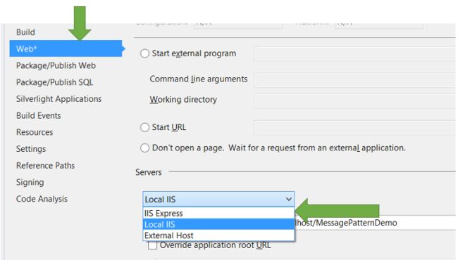 In Properties select Web tab. In Web tab from Servers drop down select local IIS.