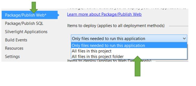 Next click on Package/Publish Web tab and from Items to deploy drop down select Only Files Needed to run this application.