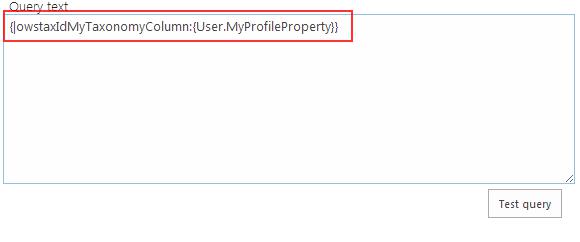 I have added a query like {|owstaxIdMyTaxonomyColumn:{User.MyProfileProperty}}