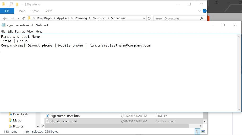 It will create a text file in the C:\Users\<username> \AppData\Roaming\Microsoft\Signatures\signaturecustom.txt for the first time. This file needs to be changed as per the user data.