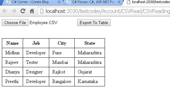 Now, on selecting this CSV file and clicking on "Export To Table" button will export the data to the table, as shown below.