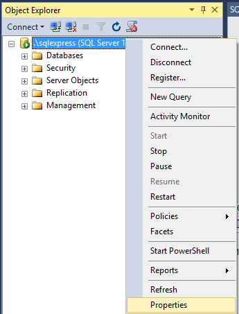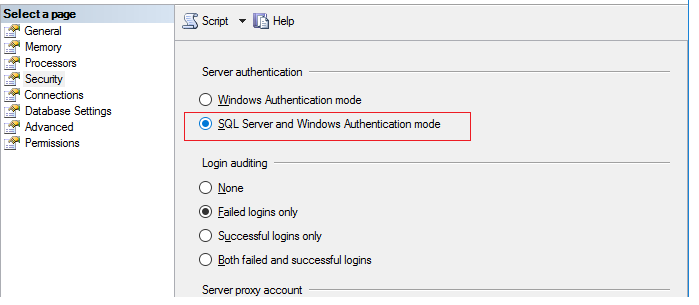 Under Security tab, click on "SQL Server and Windows Authentication mode".