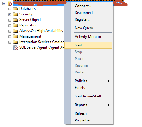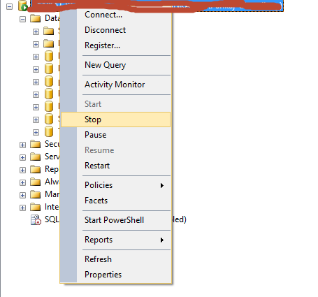 This error occurs because an instance of SQL Server is running , before trying to copy the database files we need to stop the sql server instance. To stop the SQL Server instance first right click on your Server name in SQL Server.