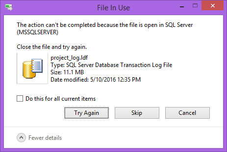 Sometimes we are required to copy the database files(.mdf, .ldf) from SQL Server root directory to another directory or disk. Then SQL Server throws an error that "The Action can't be completed because the file is open in SQL Server(MSSQLSERVER)."