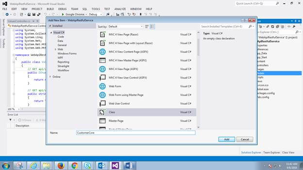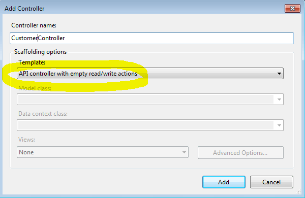 - Create Controller with API read/write action template. Note that here, we are adding API Controller so it's extending the ApiController.
