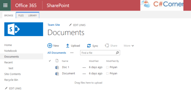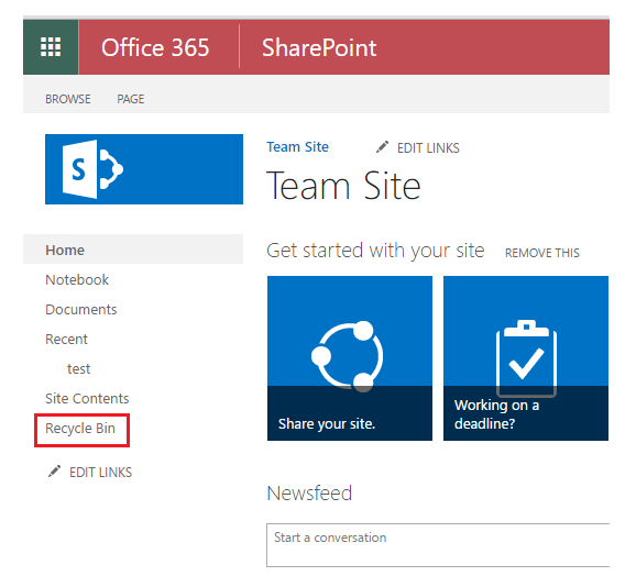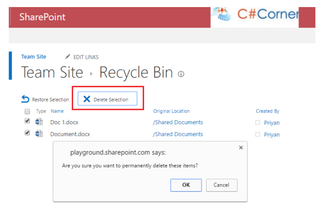 Say, we have two documents in the Shared Documents Library. Let’s go ahead and delete them. It will be moved to the recycle bin. We can spot the recycle bin in the quick launch.