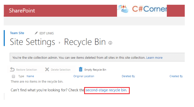 You can go to the second stage recycle bin by either appending ‘_layouts/15/AdminRecycleBin.aspx?View=2&ql=1’ in the browser URL or by clicking on the link below,