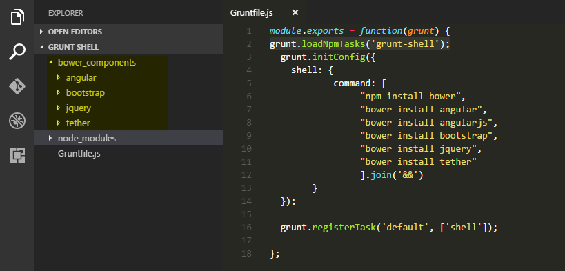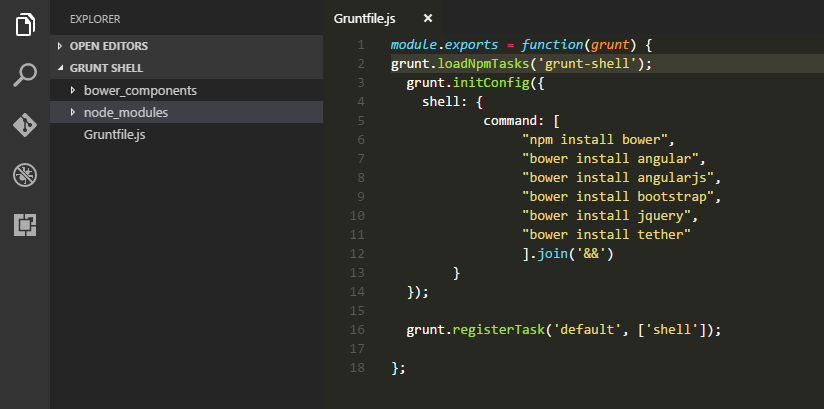- command: ["npm install bower", "bower install angular", "bower install angularjs", "bower install bootstrap", "bower install jquery", "bower install tether"].join('&&')