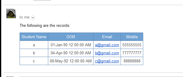 - Now, run and click “send as email” button. Check that you will be getting an Email to “to address”, which you provide and the output is shown below.