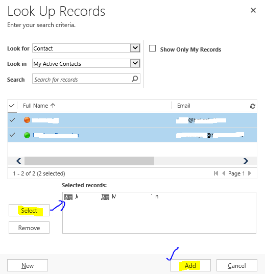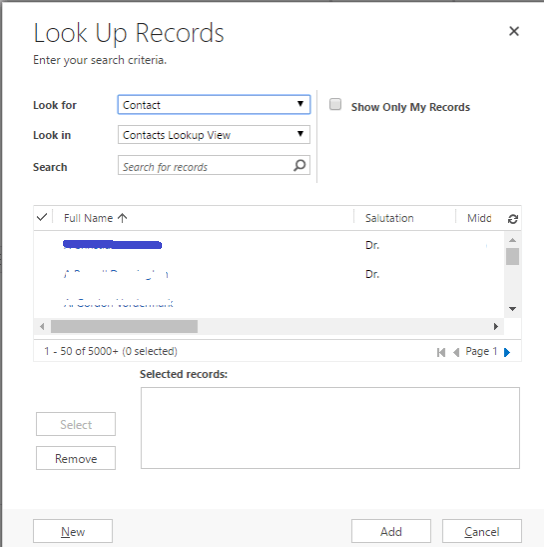Now, select the contact entity from the Look for and Look in for the appropriate contacts view.