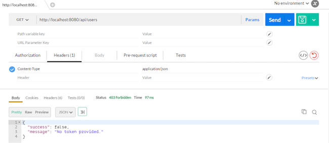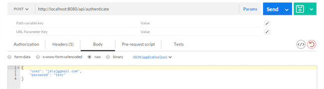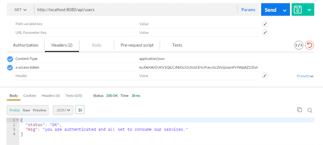 We have added localhost:8080/api/authenticate as a route where you can get secure token if you are having valid credentials. We will be sending this token in http header of our request. This token could be used for subsequent request made to our application. Our token has a expire time and it could be set within the application.