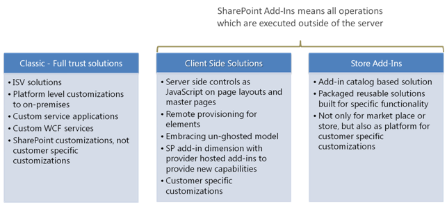 So unless you are extending SharePoint or customizing SharePoint Server product which required full trust solutions, as shown in below snapshot, add-in model is the way forward for implementing customer specific customizations . These add-ins does not necessarily means that SharePoint is to be deployed on cloud or that they are only applicable to Office 365; add-ins are applicable for on-premise installations as well.