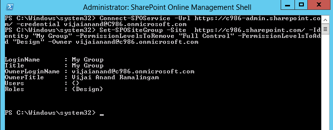 Connect-SPOService -Url https://c986-admin.sharepoint.com/ -credential [email protected]