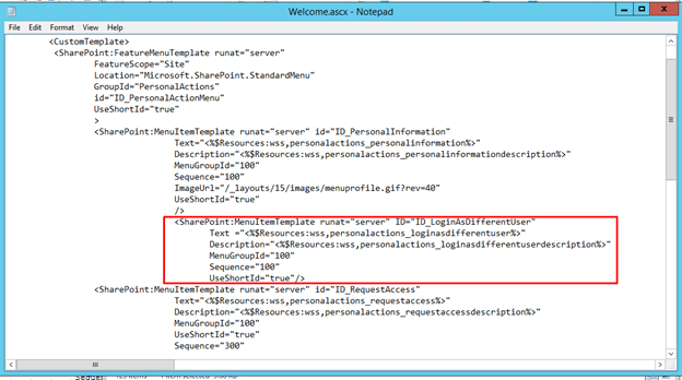 - <SharePoint:MenuItemTemplate runat="server" ID="ID_LoginAsDifferentUser" Text="<%$Resources:wss,personalactions_loginasdifferentuser%>" Description="<%$Resources:wss,personalactions_loginasdifferentuserdescription%>" MenuGroupId="100" Sequence="100" UseShortId="true" />