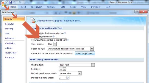 Now I am going to show the process, which I did to get the output, shown above. As a first step, we need to enable the developer tab in Excel. By default, it won’t be available. To enable it, just see the snapshot, given below especially Office button ->Excel Option->Popular.