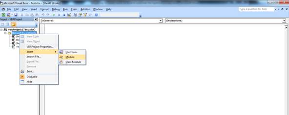 Now right click on Microsoft Excel object folder and insert the module, as shown below.