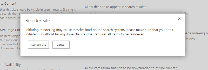 Click on Reindex site again to confirm. The content will be re-indexed during the next scheduled search crawl.