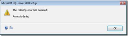 Problem: When installing SQL Server 2008 we get an Access is Denied Error.