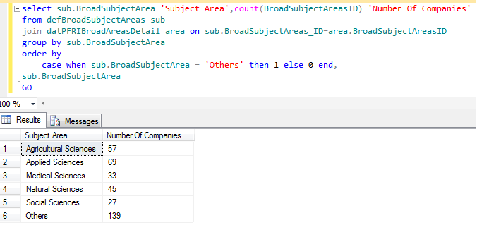- select sub.BroadSubjectArea 'Subject Area',count(BroadSubjectAreasID) 'Number Of Companies' from defBroadSubjectAreas sub