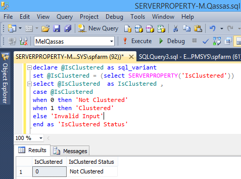 - set @IsClustered = (select SERVERPROPERTY('IsClustered'))