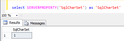 - select SERVERPROPERTY('SqlCharSet') as 'SqlCharSet'.