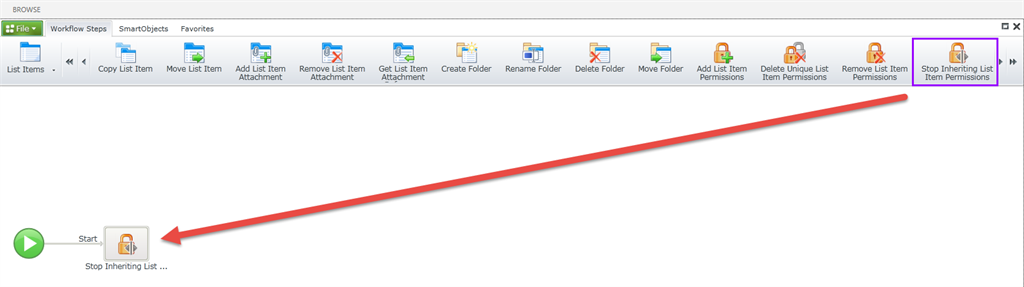 Go to K2 designer, drag and drop Stop Inheriting List Item Permissions step from the List Item workflow steps in the ribbon interface.