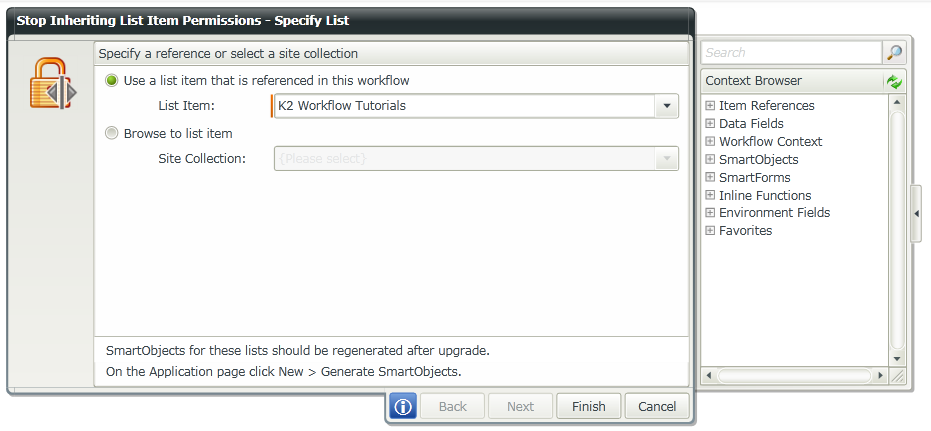 Specify the list for which you have to stop inheriting list item permissions and then click on Finish button.