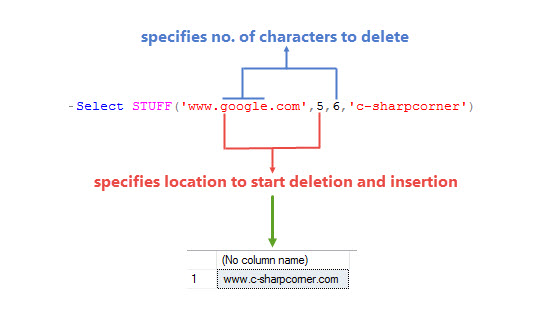 - Select STUFF('www.google.com',5,6,'c-sharpcorner')