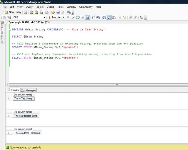 We have declared a simple string and applied STUFF function with two different arguments. In first, we have specified the 9th position as the start_point and 2 as the length of the characters to be replaced in the existing_string. So it updates the existing string accordingly. In second case, we have specified the length as 0. So it does not replace any character in the existing_string and just fits the new string at the specified position i.e. 9th position. Similarly we could have used any table column in the Select statement above.