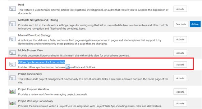 To achieve this function, we need to enable the site feature named Offline Synchronization for External List as follows.