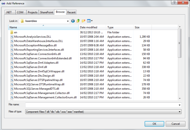 Step 3: Then select Browse tab and locate folder "C:\Program Files\Microsoft SQL Server\100\SDK\Assemblies” as follows.