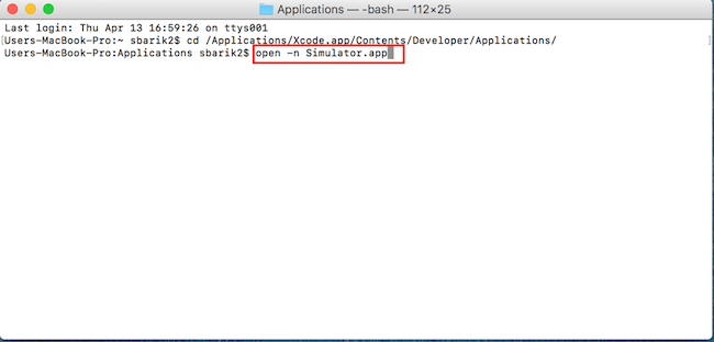 In this directory, open the Simulator app. By writing the command, open -n Simulator.app.