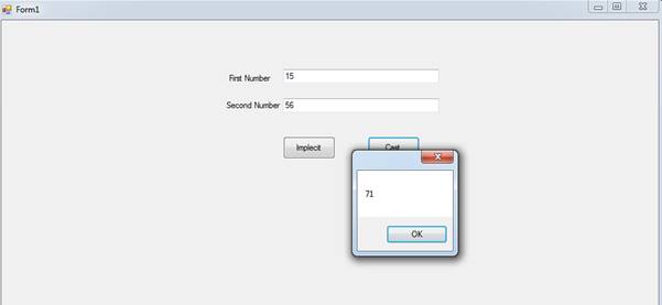 Explicit Conversion is done by the users according to their need/requirement. We tell the compiler to do the conversion. Let us see how we can do Explicit Conversion. I wrote the code on the cast button click event, as you can see below.
