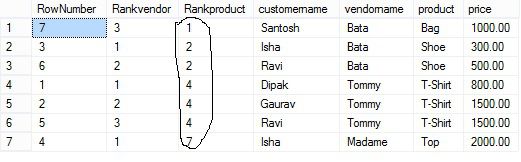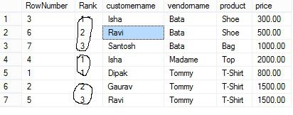 - select ROW_NUMBER() over (order by customername) RowNumber, ROW_NUMBER() over (partition by vendorname order by customername) Rankvendor,rank() over (order by product) Rankproduct, customername, vendorname, product, price from #Saletable