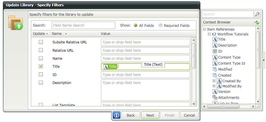 Go to K2 designer, drag and drop Update Document Library step from the Libraries workflow steps in the ribbon interface.
