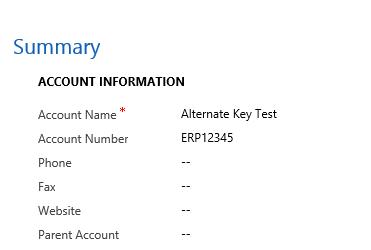 - Entity account = new Entity(“account”, “accountnumber”, “ERP12345″);