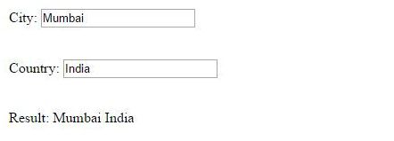 - City: <input type="text" ng-model="city"><br><br><br> Country: <input type="text" ng-model="country"><br><br><br> Result: {{output()}}