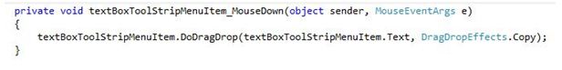 2. I think the “MouseDown” is the best event for starting the drag operation. Code on the textBoxToolStripMenuItem_MouseDown