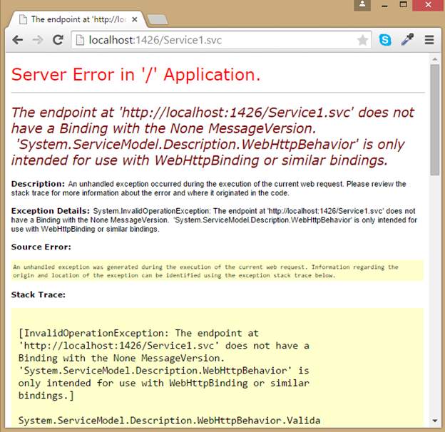 While building WCF REST service if you get below error message Image 1 WCF REST service if you get below error message Then make sure your WCF service Project’s web.config file should have below System.ServiceModel setting.