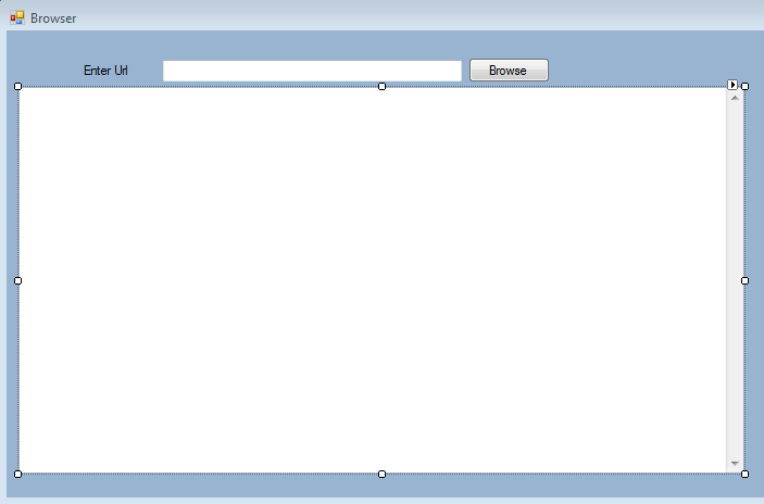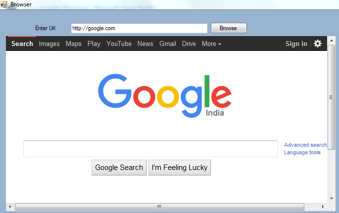 Here I am explaining the web browser control in windows form. This control is just like a browser, it will open any web site in it.