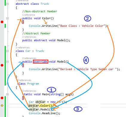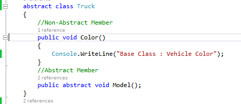 Now, we can create one derived class car to implement abstract method but when we implement an abstract method in derived class, use override keyword before Method name, as shown below.