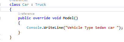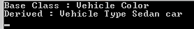 - Console.WriteLine("Derived : Vehicle Type Sedan car ");
