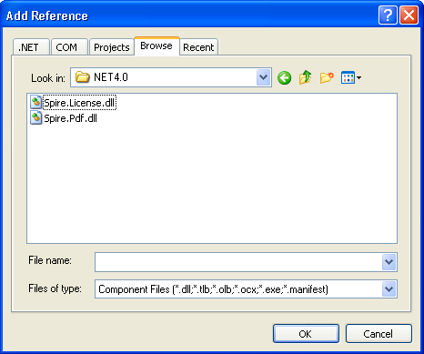 Spire.PDF has a bin folder, which contains .NET2.0, .NET3.5, .NET4.0 and NET4.0 ClientProfile. Firstly, add the correct dll based on your own projects. I use .NET 4.0 for this project.