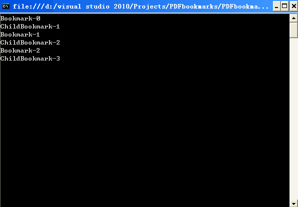 When we set the PDF bookmarks, we can get the title of the bookmarks. Free Spire.PDF offers a class called Spire.Pdf.Bookmarks.PdfBookmarkCollection. Using this class, we can collect all the parent bookmarks in PDF file. After that, we need to make clear about whether there are child bookmarks in PDF file. If it has bookmark, we can use the methods provided by Microsoft: System.Console.WriteLine(string value) to get the title of bookmarks.