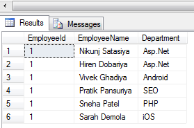 - INSERT INTO #Temp (EmployeeId, EmployeeName, Department) VALUES (1,'Hiren Dobariya','Asp.Net')