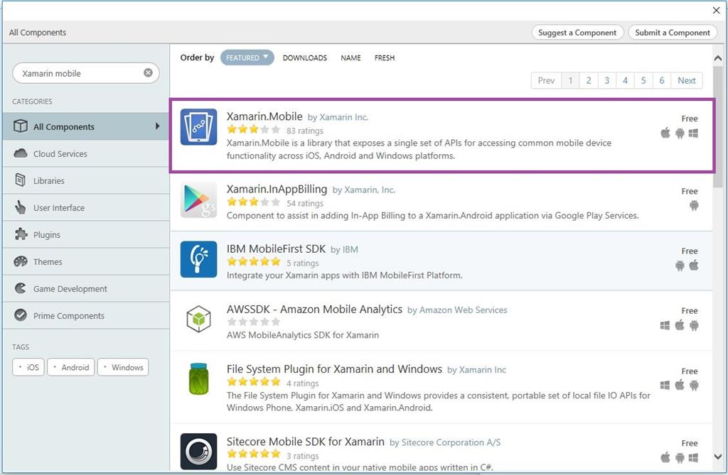 Step 2: Next go to Solution Explorer-> Project Name-> Components then Right Click to Get More Components then open new Dialog box. This dialog box to search the Xamarin.Mobile then Click Add App.