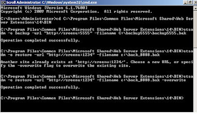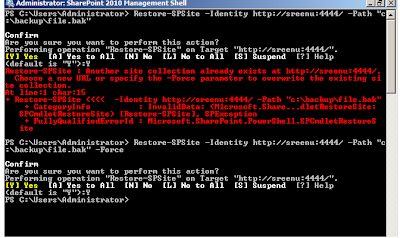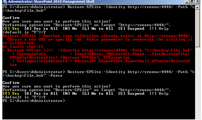 C:\Users\Administrator> Restore-SPSite -Identity http://sreenu:4444/ -Path